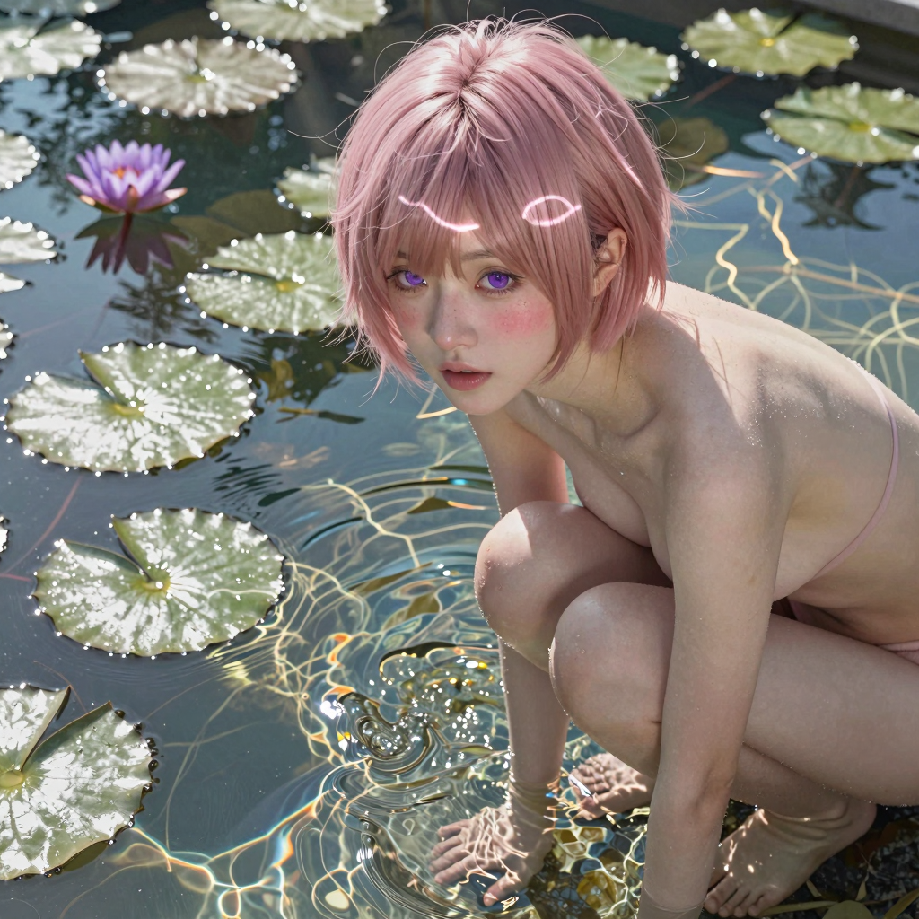 Stunning solo erotic art featuring petite Mira with pink hair and violet eyes by the poolside. Hyper-realistic details and artistic nude photography.